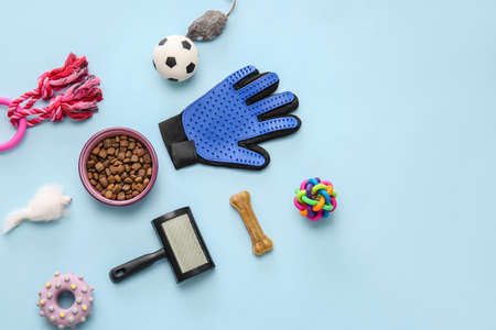 Pet care accessories on light background