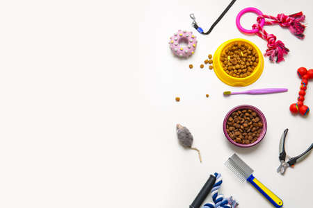 Different pet accessories on white background, top view