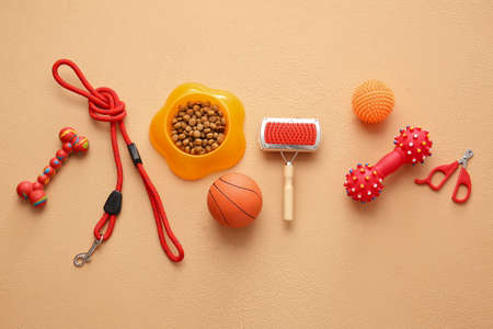 Different pet care accessories on color background