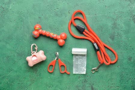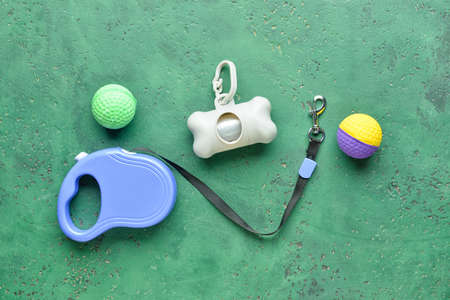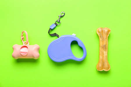Pet waste bags, leash and chew bone on green background