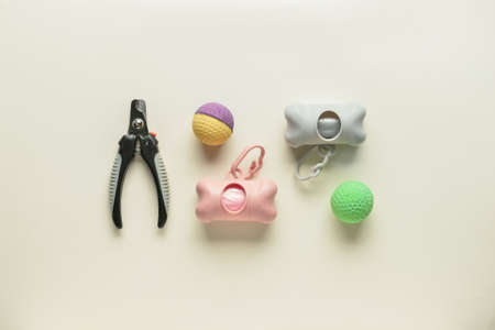 Dispensers with pet waste bags, balls and nail clipper on color background