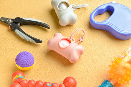 Different pet care accessories and dispensers with pet waste bags on color background