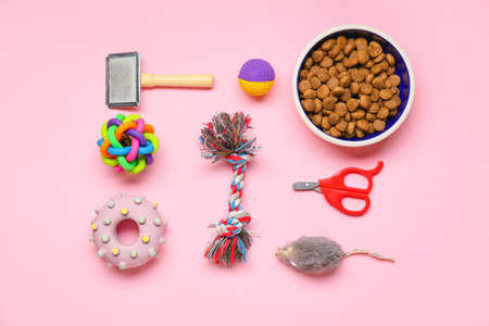 Pet care concept, various pet accessories and tools, toys, balls, brushes on pink background, flat lay