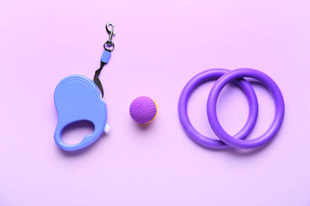 Leash, toy ball and inflatable rings on color background
