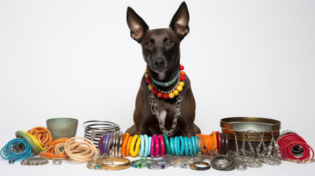 Various pet accessories displayed in an organized manner, including soft clothing, a leash, bowls, and toys, all on a textured background.