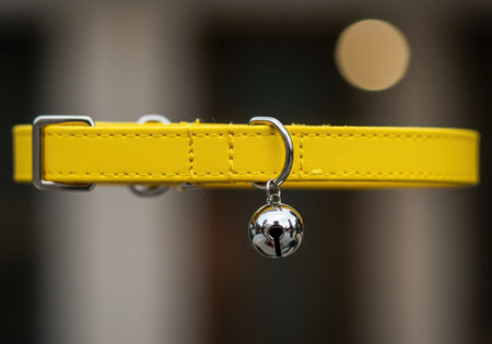 A close-up shot showcases a vibrant yellow pet collar, complete with a shiny silver bell. The collar features a matching buckle and is designed for the safety and identification of a beloved pet.