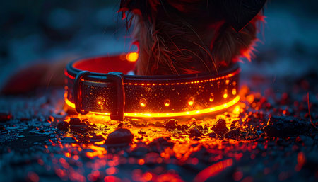 In the deep blue twilight, a loyal companion stands ready for adventure, its path illuminated by a futuristic glowing collar. The warm, vibrant light casts a protective aura on the ground, symbolizing safety, technology, and the unbreakable bond between a pet and its owner on a nighttime exploration.