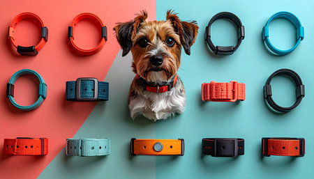 A cute terrier faces a big decision, surrounded by a vibrant collection of modern collars. This image captures the concept of choice in pet care, from stylish accessories to smart GPS tracking technology, highlighting the options available to todays dedicated pet owner.