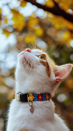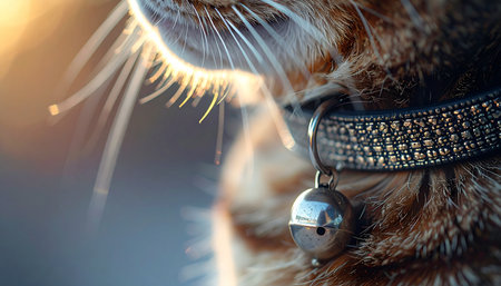 A close-up macro shot captures the quiet elegance of a domestic cat. Bathed in the warm glow of morning sunlight, its jeweled collar and tiny bell glint, hinting at a cherished and pampered life. The soft focus creates a dreamy, affectionate mood.