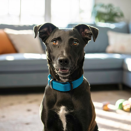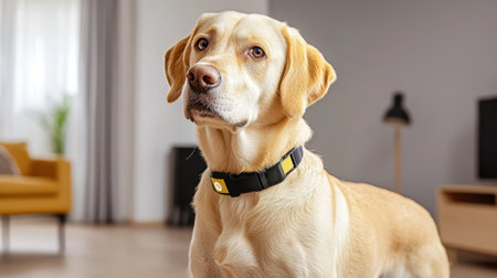 A Labrador dog wearing a collar sits in a cozy living room, showcasing its friendly demeanor and curious expression, perfect for pet lovers and home themes.