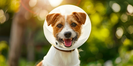 A happy dog wearing a medical cone standing outdoors in a sunny garden, symbolizing recovery and resilience with a cheerful demeanor. High quality photo
