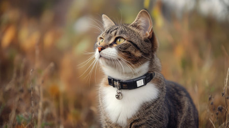 Cat walking outdoors wearing small streaming camera on it's collar. Pet wearing gps tracking device. Generative AI.
