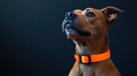A striking profile of a brown dog with an orange collar, displaying an alert and curious expression against a seamless dark background, perfect for animal lovers and pet enthusiasts.
