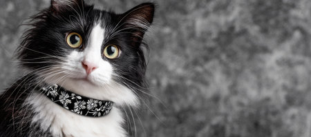 A striking black and white cat is captured in a close-up portrait, revealing its expressive eyes and patterned collar. The image showcases soft textures and subtle lighting. Suitable for a range of commercial applications, the photograph is ideal for illustrating pet-related content and design projects.