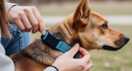 A close-up shot showing a dog owner's hands carefully fastening a new blue collar around the neck of their calm, brown mixed-breed dog. The image illustrates the concept of pet care, responsibility, and the bond between a human and their animal companion.