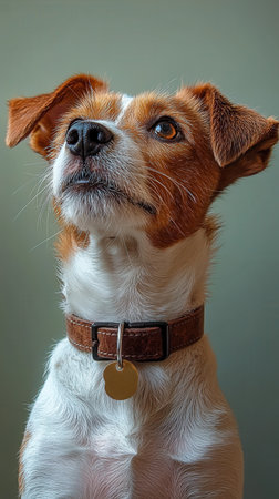 Portrait of a brown and white dog looking upwards with collar