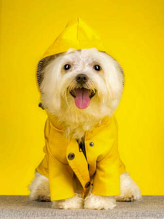Cute havanese dog in waistcoat and sunglasses sitting on white surface isolated on yellow