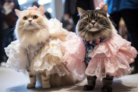 cute and fluffy models strutting their stuff on the catwalk in unique feline and canine inspired outfits, created with generative ai