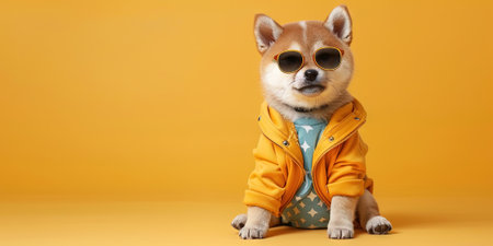Shiba inu dog in yellow jacket and sunglasses on yellow background