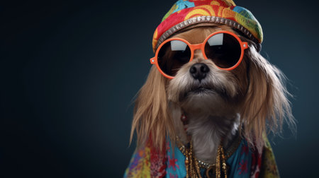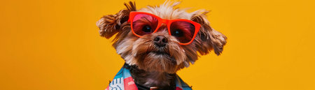 A small dog makes a fashion statement with colorful clothes and red sunglasses on an orange background.