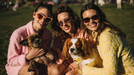 Women dressed in bright, cozy outfits are smiling while holding their small dogs in a sunny park, capturing a moment of joy and companionship, AI generated