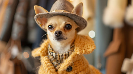 A close up image of a small tan chihuahua dog standing on its hind legs and appearing to be trying on a miniature high end fashion outfit or accessory within a luxurious well appointed retail store
