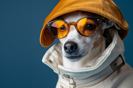 Funny Jack Russell dog with orange glasses, yellow hat and scarf on a blue background.