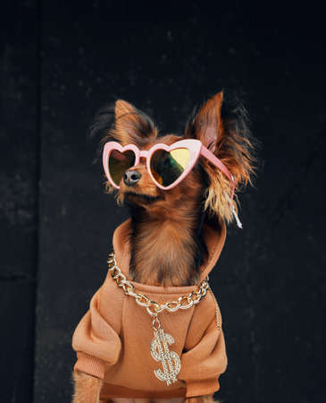 Funny dogs in sunglasses and clothes on a colored background. Kidkore style, the concept of humanization