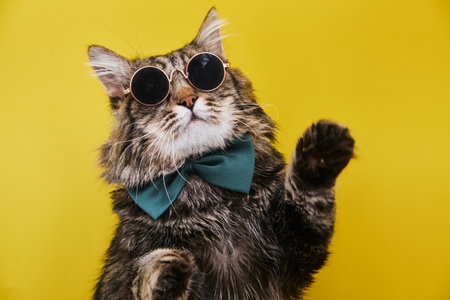 This charming image showcases an adorable cat wearing glasses and a vibrant hat, posing playfully against a bright yellow background, capturing joy and style.