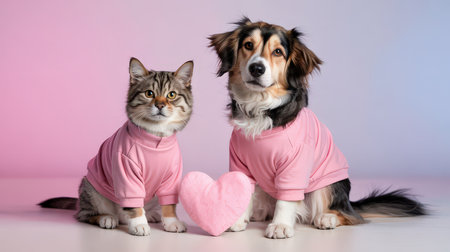 A playful dog and cat sit side by side, both wearing matching pink outfits, with a heart-shaped pillow between them.