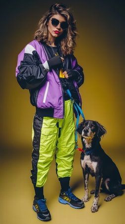 A fashionable woman poses confidently with her stylish dog in a vibrant studio setting, showcasing a captivating fusion of urban attire and playful companionship.