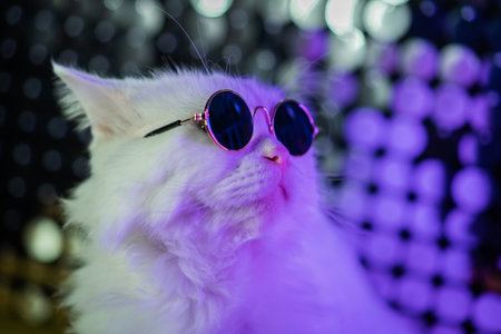 Luxurious domestic kitty in glasses poses on purple background.Portrait of white furry cat in fashion eyeglasses. Studio neon light