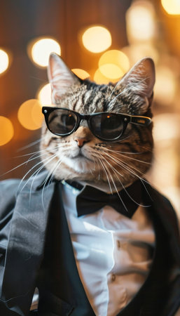 Fashionable cat in sunglasses and formal wear on blurred background with copy space