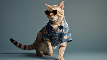 Cat in sunglasses and Hawaiian shirt, striking a fun pose