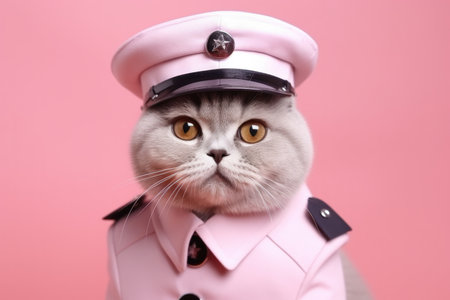 British Shorthair Cat Dressed As A Policeman On Blush Color Background. Сoncept British Shorthair Cats, Policeman Costume, Blush Color, Shopping For Pet Clothes.