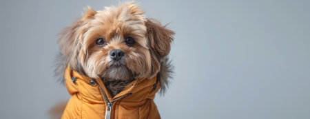 Shih Tzu dog wearing a yellow winter jacket with a gray background.