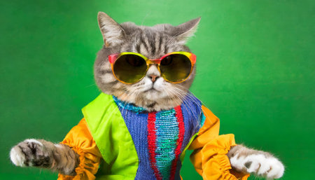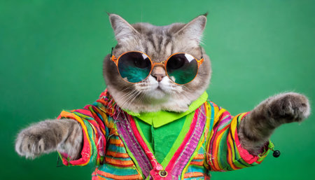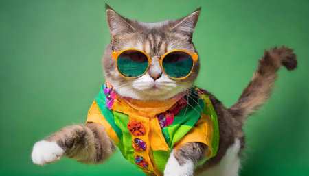 This lively and playful image features a stylish cat adorned in brightly colored clothes and sunglasses, dancing on a vivid green background. It captures a joyful, dynamic moment full of vibrant