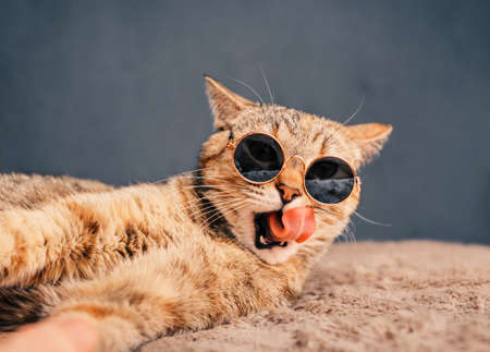 A domestic cat in stylish round sunglasses licks its lips while lying on a plaid.