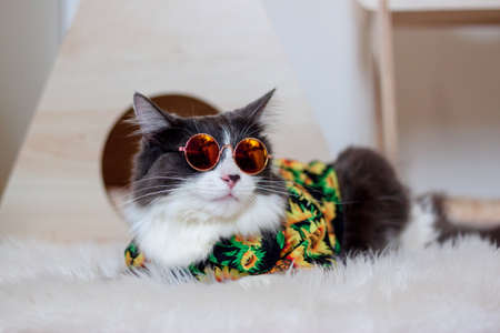Domestic medium hair cat in Summer Sunflower Oil Painting shirt wearing sunglasses lying and relaxing on Fur Wool Carpet. Blurred background. Relaxed domestic cat at home, indoor