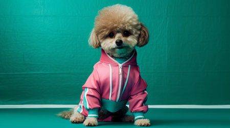 Cute poodle dog wearing pink sunglasses and pink sweater on pink background