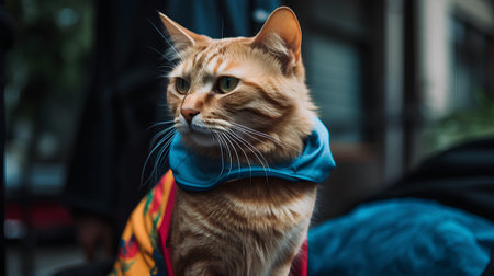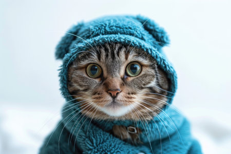 Portrait of a beautiful tricolor cat wearing a warm jacket
