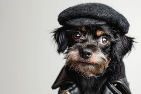 Adorable dog dressed in a fashionable hat and scarf looking up with a cute expression