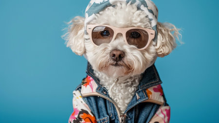Dog in stylish outfit and sunglasses, blue background, fashionable portrait, closeup