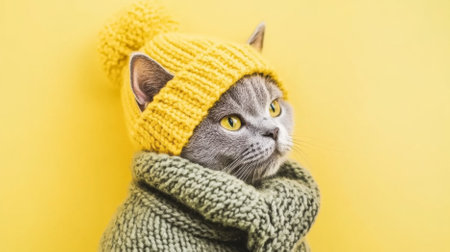Gray Cat in cozy knitted hat and sweater against color background, AI Generated