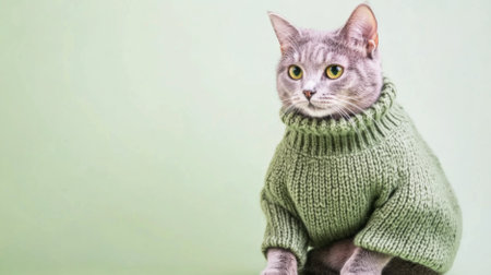 Gray Cat in cozy knitted sweater against color background, AI Generated