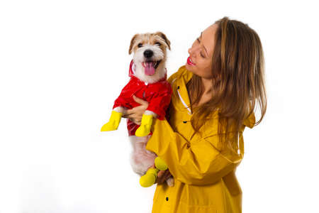 Portrait of a smiling girl in a yellow raincoat with a dog Jack Russell Terrier in a red jacket in her arms. isolated on white background.