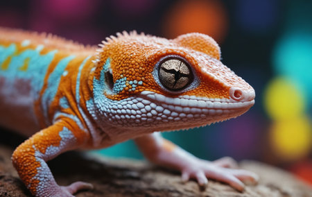 A detailed image features a gecko perched on a tree branch, showcasing striking purple and orange hues. The background displays an array of colorful bokeh lights, adding depth and visual interest. Suitable for various creative projects, including editorial features and commercial advertising, the image highlights the reptile in a naturalistic setting.