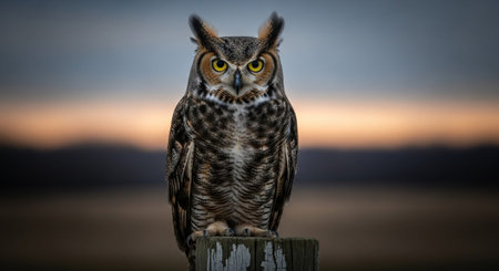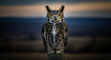 Majestic Owl Perched in the Twilight, Showcasing Beautiful Feathers and Intense Gaze, Symbol of Wisdom and Mystery in Nature's Nighttime Scene