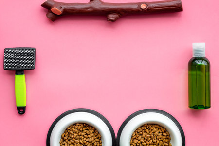 Care about pet with brushes, food and grooming equipment on pink background top view mockup