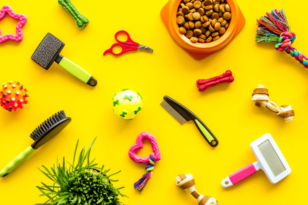 Pet care and training concept. Frame of grooming accessories for cat and dog on yellow background. Flat lay, top view.